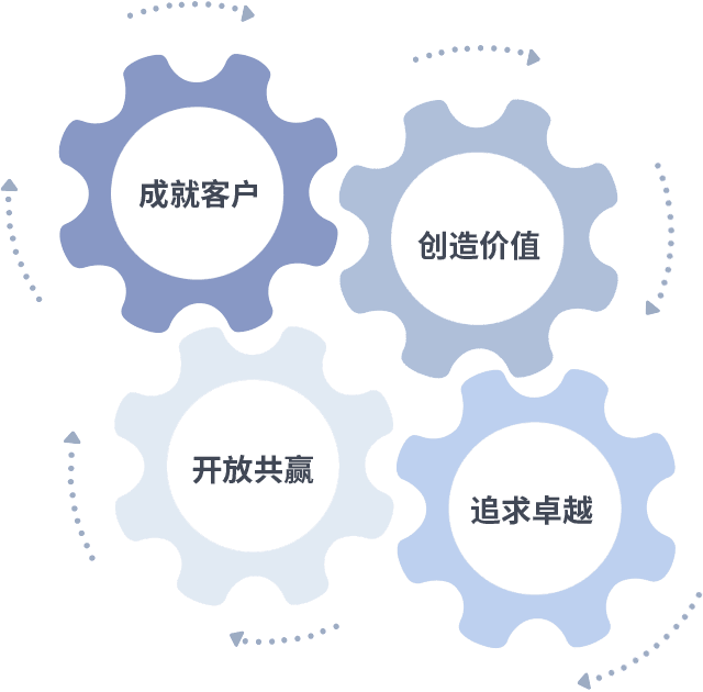 成就客户是一切决策的出发点,,,创造价值是衡量所有工作的标准,,,,追求卓越是我们做事做人的态度,,开放共赢是我们的格局也是最终的结果。。价值观的齿轮环环相扣,,推动着组织里的每个人不断向前。。。